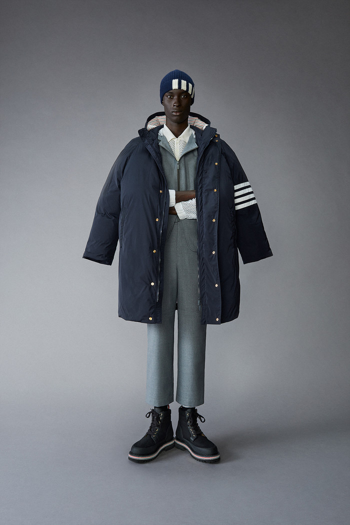 울 소재의 점퍼와 팬츠 셋업은 물론 메쉬 소재를 사용한 이너와의 매칭을 통해 스포티한 감성을 세련되게 풀어냈다. 또 이태리 고급 소재에 무광 느낌이 나는 폴리 트윌 소재의 다운필을 툭 걸치면 톰브라운의 세계에 빠져들 수 있다.