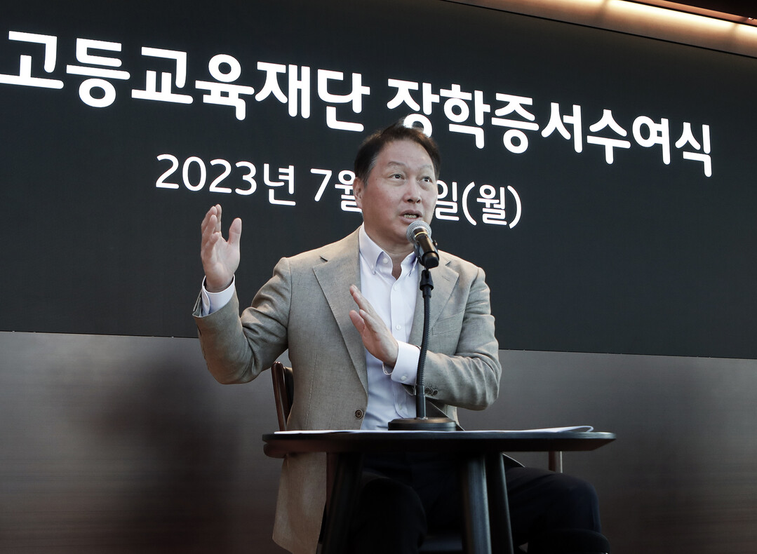 최태원 SK그룹 회장은 지난 10일 서울 종로구 SK서린빌딩에서 열린 장학 증서 수여식에서 이같이 말했다. 장학 증서는 한국고등교육재단에서 지원하는 것으로, 최 회장은 선친인 고(故) 최종현 SK 선대 회장에 이어 1998년부터 재단의 2대 이사장직을 맡고 있다.