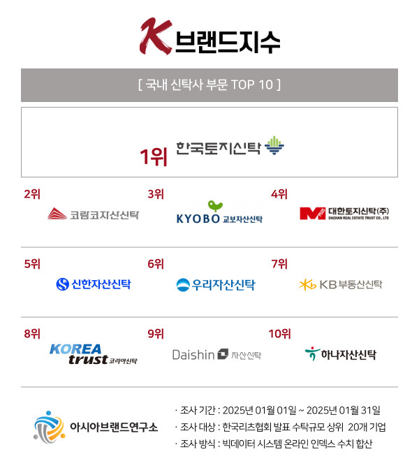 한정근 아시아브랜드연구소 대표는 “지난달 조사와 달리 신탁사 순위도 급변하는 상황에서 한국토지신탁이 또 다시 K-브랜드지수 신탁사 부문 1위를 수성했다”며 “반면 한국자산신탁이 톱10에서 탈락한 점은 눈여겨볼 필요가 있다”라고 말했다.