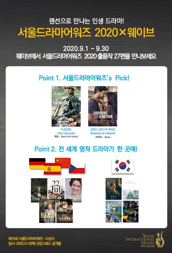 (사)서울드라마어워즈조직위원회(조직위원장 박성제)는 오는 9월 1일부터 30일까지 국내 온라인 동영상서비스 웨이브(wavve)에 ‘서울드라마어워즈 공식 온라인상영관’을 마련한다고 20일 밝혔다.