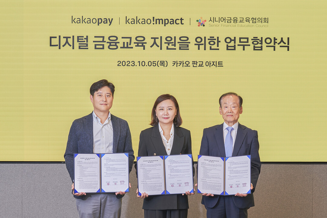 카카오페이와 카카오임팩트, 시니어금융교육협의회는 지난 5일 디지털 금융교육 지원의 첫 시작으로 ‘모두를 위한 디지털 금융교육 3자 협약’을 체결했다.