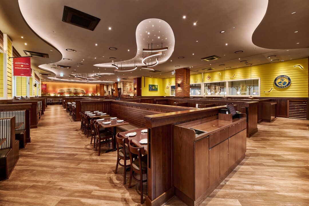 다인 가족과 모임을 위해 창가 쪽으로 6인석 테이블이 배치됐고, 외관은 미국 아웃백의 정통성을 반영한 그린 캐노피 디자인으로 꾸몄다. 또 호주의 상징 ‘울룰루’에서 영감을 받은 실내 인테리어가 눈길을 끈다.
