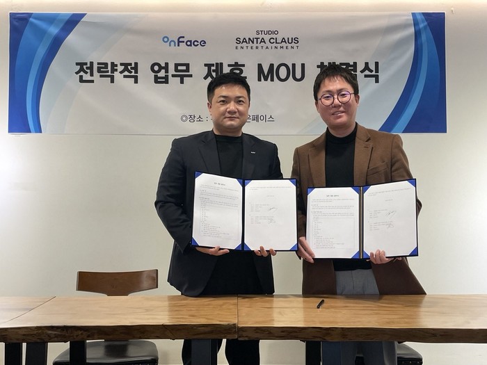 | ▲ 김민석 온페이스 대표(왼쪽)와 배준오 스튜디오 산타클로스 대표이사가 업무협약 후 기념촬영을 하고 있다. [사진=온페이스] |