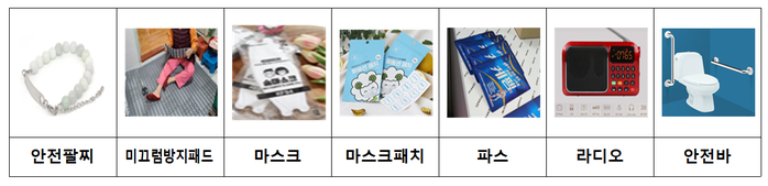| ▲ 소방안전강사 어르신 안전교육 및 안전물품 7종 지원-안심화재예방세트(7종) : 간이소화기, 가스차단기, 단독경보형 연기감지기, 단독경보형 열감지기, 구조손수건, 소방포, 소화패치(콘센트) |