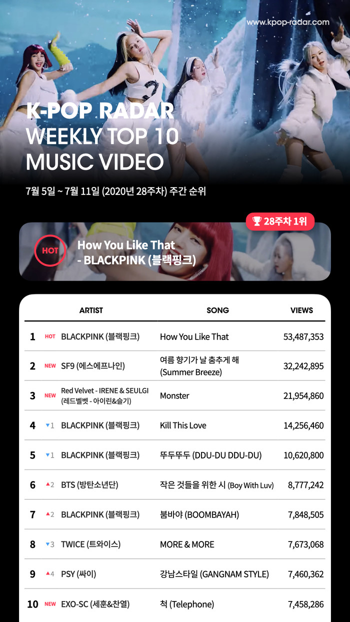 이 외에도 블랙핑크의 ‘킬 디스 러브’(1425만 뷰)를 비롯해 블랙핑크의 ‘뚜두뚜두(DDU-DU DDU-DU)’(1062만 뷰), 방탄소년단의 ‘작은 것들을 위한 시(Boy With Luv)’(877만 뷰), 블랙핑크의 ‘붐바야’(784만 뷰), 트와이스의 ‘모어 앤 모어(MORE & MORE)’(767만 뷰), 싸이의 ‘강남스타일’(746만 뷰) 등이 주간 케이팝 레이더 TOP10에 이름을 올렸다.