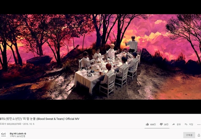 [하비엔=노이슬 기자] 그룹 방탄소년단의 '피 땀 눈물' 뮤직비디오가 6억뷰를 돌파했다.