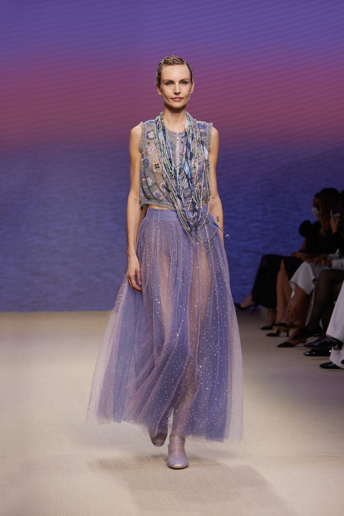 이브닝 웨어는 빛의 향연이다. 빛을 발하면서 동시에 무게감이 느껴질 수 없을 만큼 살짝살짝 몸을 스치는 튤 레이어의 드레스가 녹아들어 놀라움을 선사하며 무한히 부드러운 컬러 뉘앙스를 만들어냈다.