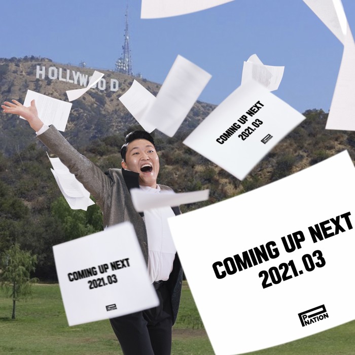 공개된 이미지 속 싸이는 할리우드를 배경으로 'COMING UP NEXT 2021.03'이라고 적힌 전단을 뿌리고 있는 모습이다. 싸이의 밝은 표정이 이번 티저의 주인공에 대한 기대감을 고조시킨다.