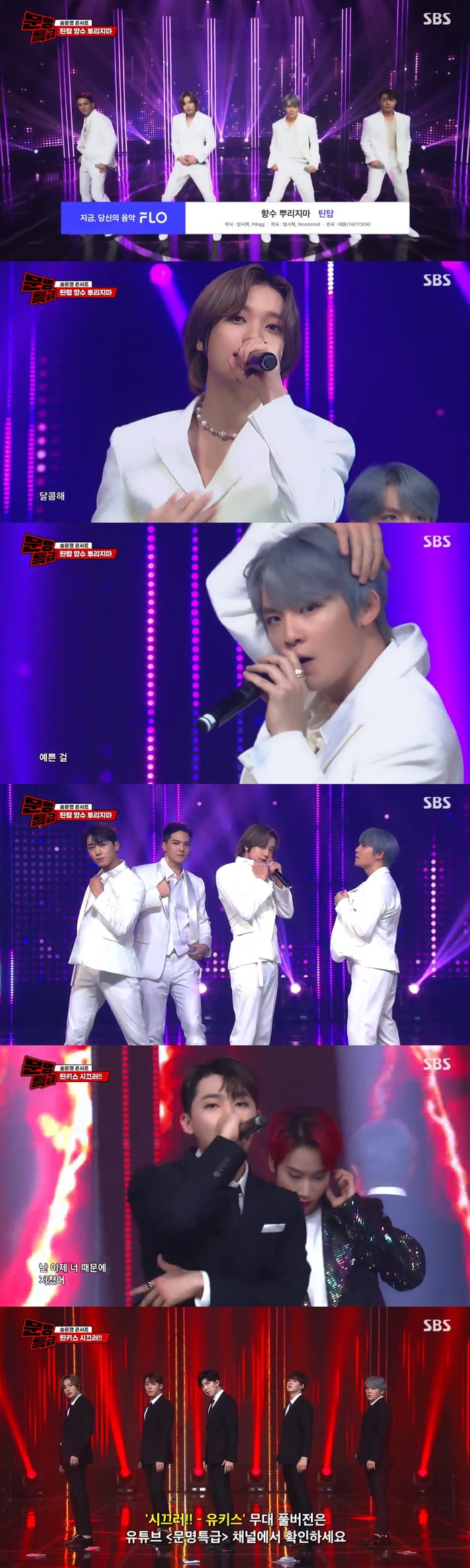틴탑은 지난 2일 방송된 SBS 추석특집 문명특급 ‘숨듣명(숨어서 듣는 명곡) 콘서트’에 출연해 ‘향수 뿌리지마’ 무대를 선보였다. ‘향수 뿌리지마’는 설렘이 느껴지는 멜로디와 달리 반전 있는 가사가 특징인 곡이자 대표적인 ‘숨듣명’으로 손꼽히는 노래. 틴탑은 2020년 버전 ‘향수 뿌리지마’를 선보이며 변함없는 비주얼과 풋풋함을 뽐내 시선을 사로잡았다.