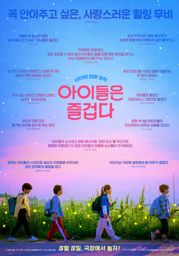 환상적인 색감으로 표현된 하늘아래 한적한 시골길을 걷고 있는 아이들은 힘들고 고된 여정에 지친 기색이 역력하지만 이 모습 마저도 귀엽고 사랑스러움을 물씬 풍겨 보는 이들의 미소를 자아낸다. 함께 공개된 <아이들은 즐겁다>의 리뷰 스팟 역시 속상한 일도, 즐거운 일도, 고민할 일도 많은 아홉살 ‘다이’와 친구들이 함께 여행을 떠나는 모습을 보여주며, 영화에 대한 따뜻한 호평을 담고 있어 눈길을 끈다.