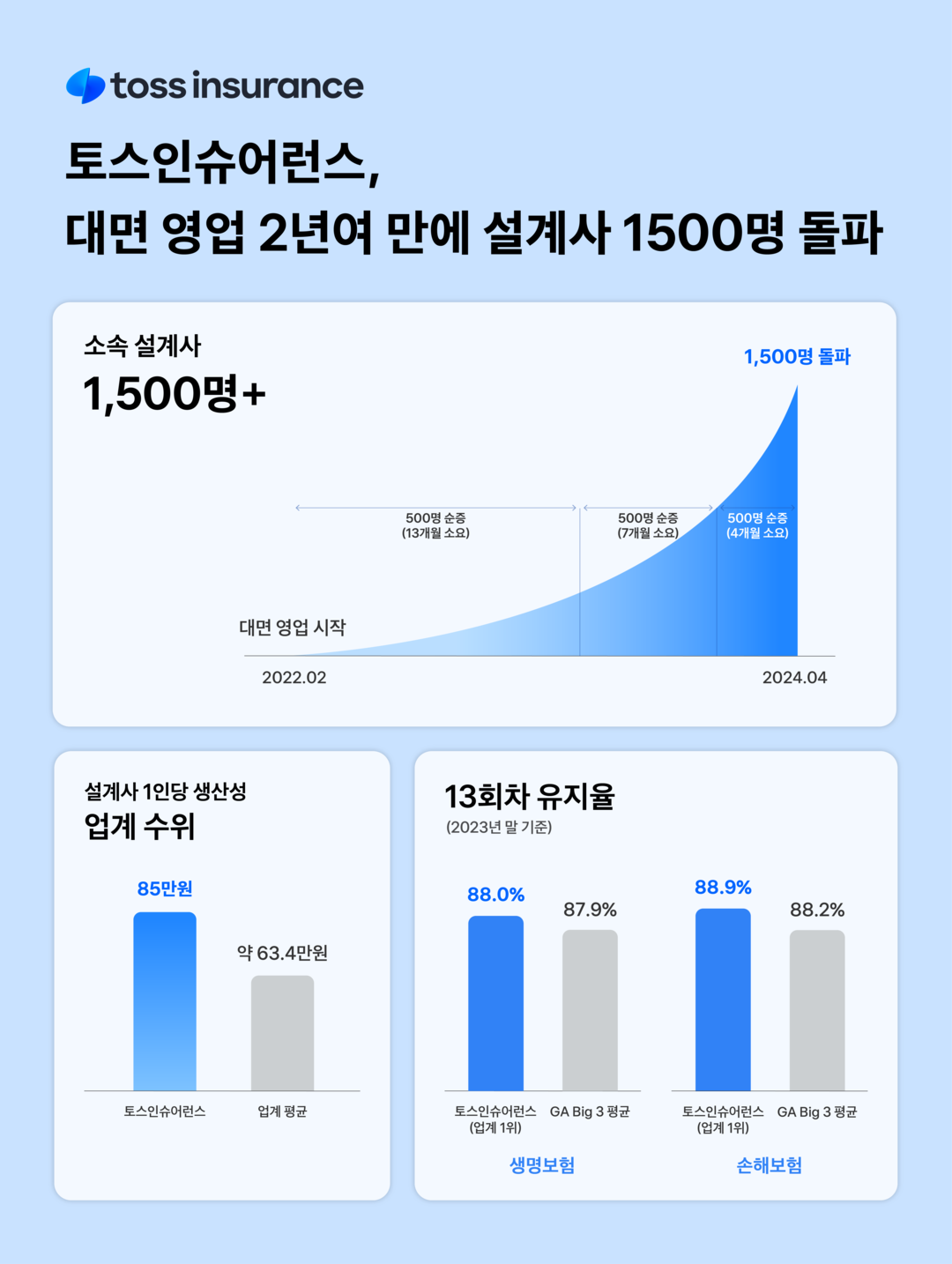 토스인슈어런스는 독립형 GA로서 인수합병(M&A) 없이 자력으로 최초 설계사 500명을 보유하는 데 13개월이 걸렸다. 이후 500명 순증에 7개월, 추가로 500명이 늘기까지 불과 4개월이 소요되는 등 우상향의 기울기도 가팔라지고 있다.