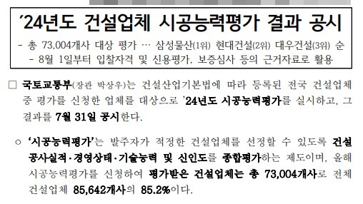 | 국토교통부에서 발표한 2024년도 건설업체 시공능력 평가 결과 공시 표지 |