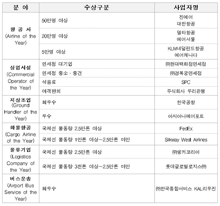 항공사 분야에서는 코로나19 상황에서도 운항을 중단하지 않고 스마트서비스 확대에 기여한 대한항공 외 5개社 △상업시설 분야에서는 고객만족도가 우수한 ㈜현대백화점면세점 외 3개社 △지상조업 분야에서는 안전관리 우수성을 인정받은 한국공항 외 1개社 △화물항공 분야에서는 물류허브 발전에 기여한 FedEx 외 1개社 △물류기업 분야에서는 물류전문성을 인정받은 ㈜쉥커코리아 외 1개社 △버스운송 분야에서는 친절서비스가 우수한 ㈜한국종합서비스KAL리무진이 올해의 우수사업자로 선정됐다.