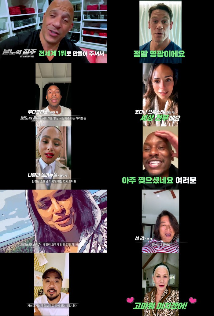 "여러분들께 감사 인사를 전하고 싶습니다. <분노의 질주>를 전 세계 1위로 만들어 주셔서 가슴 깊이 감사드립니다"(빈 디젤), "전 세계 최초로 영화를 봐주셔서 정말 영광이예요"(존 시나), "<분노의 질주> 시리즈를 항상 사랑해주시는 여러분들 여러분이 저희에겐 세상 전부예요"(루다크리스 & 조다나 브류스터), "엄청난 오프닝 기록에 정말 감사드려요"(나탈리 엠마뉴엘), "한국, 러시아, 이집트 모두 아주 찢으셨네요 여러분들!"(타이레스 깁슨), "흥행 기록을 만들어 주신 것 <분노의 질주> 패밀리 모두가 정말 정말 감사드려요 사랑해요"(미셸 로드리게즈), "돌아오니 좋네요"(성 강), "<분노의 질주> 시리즈는 오직 여러분의 사랑과 성원으로 만들어 집니다. 여러분께 영화를 보여드릴 수 있다는 것이 저희에게는 무엇보다도 의미 있는 일입니다"(저스틴 린 감독), "<분노의 질주> 패밀리 전부가 감사해요. 런던 식으로 얘기하면 고마워 미치겠어!"(헬렌 미렌), "여러분을 위해 만들었고, 여러분 없이는 불가능했습니다"(<분노의 질주: 더 얼티메이트> 패밀리).