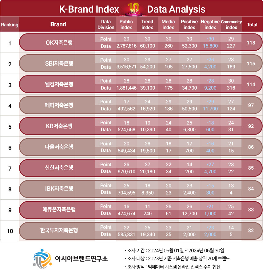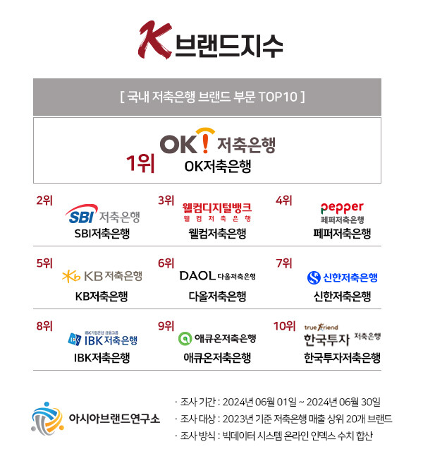 그 결과 K-브랜드지수 저축은행 부문 1위는 OK저축은행이 차지했고, SBI저축은행(2위), 웰컴저축은행(3위), 페퍼저축은행(4위), KB저축은행(5위), 다올저축은행(6위), 신한저축은행(7위), IBK저축은행(8위), 애큐온저축은행(9위), 한국투자저축은행(10위)이 10위 안에 이름을 올렸다.