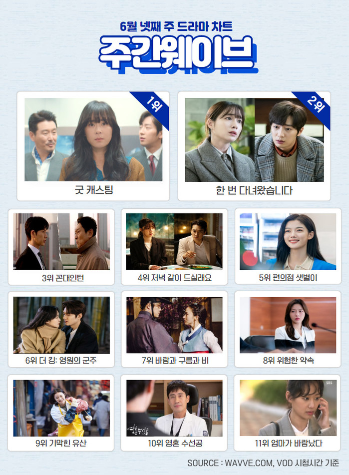 23일 주간웨이브(wavve) 드라마 차트에 따르면 첫방 이후 꾸준히 상위권을 유지하며 인기를 끌었던 '굿캐스팅'이 지난 주 종영과 동시에 마침내 1위 자리를 차지하며 유종의 미를 거뒀다. 첫 방 이후 무려 8주 만의 첫 1위 탈환이다.
