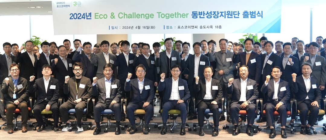 | 포스코이앤씨 애코 앤 챌린지 투게더 동반성장지원단이 출범식을 갖고 기념촬영을 하고 있다 [사진=포스코이앤씨] |