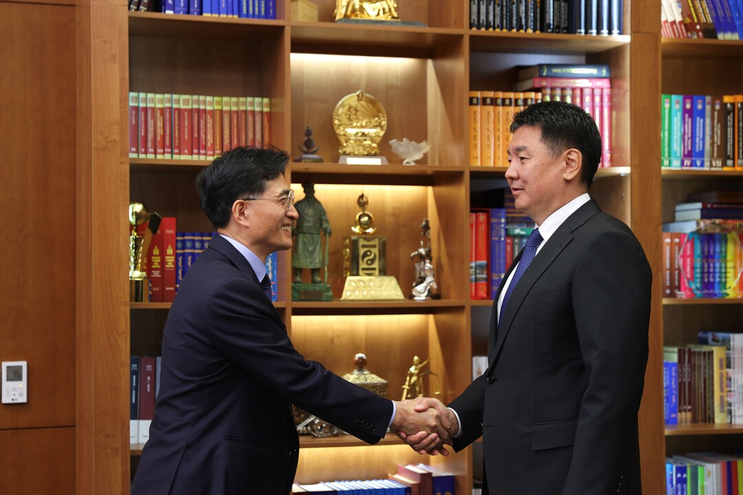 | 오흐나 후렐수흐 몽골 대통령(우측)과 진재승 유한킴벌리 대표이사 사장(좌측)이 23일 울란바토르 대통령 관저에서 진행된 면담에서 악수하고 있다 [사진=유한킴벌리] |