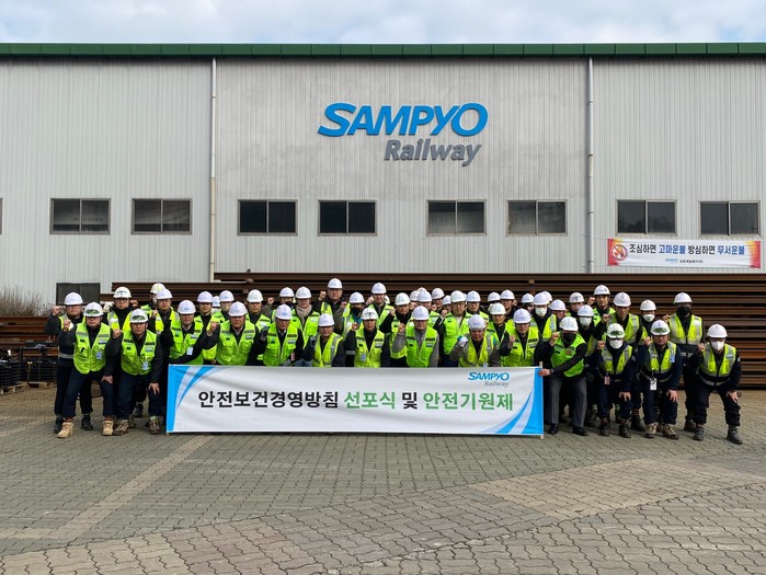 | ▲삼표레일웨이 대표사업장인 오송공장에서 대표이사를 비롯한 안전경영책임자(CSO) 등 임직원 60여명이 참석한 가운데 안전보건경영방침 선포식 및 안전기원제를 실시, 산업재해 예방 의지를 다졌다. [사진=삼표그룹] |