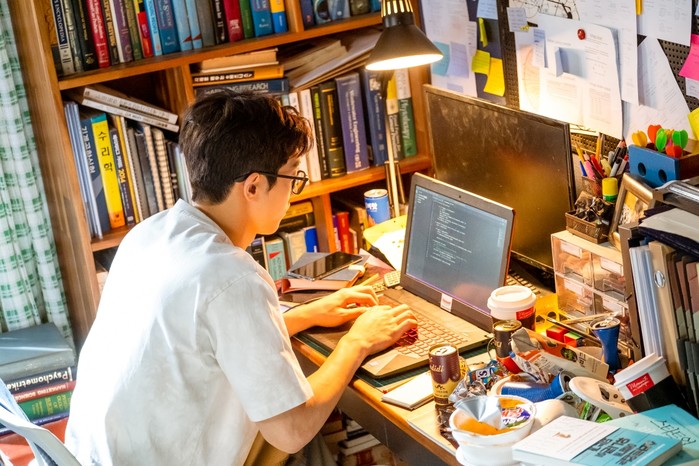 공개된 사진 속에는 매일 입는 체크무늬 셔츠에 부스스한 더벅머리를 한 남도산(남주혁)이 포착됐다. 집에서는 뿔테 안경을 끼고 본격적인 코딩 작업에 돌입, 커피와 컵라면 등 밤샘의 흔적들을 책상 한구석에 쌓아둔 채 신나게 노트북만 두드리는 너드 그 자체다.
