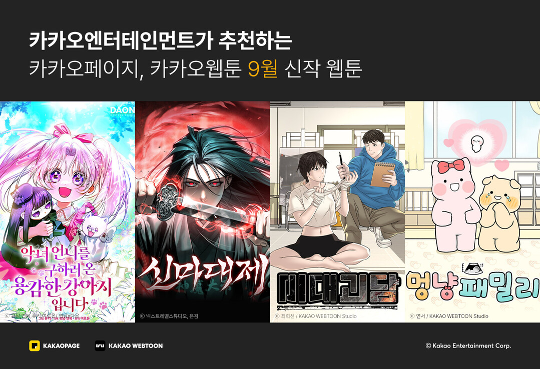 [HBN뉴스 = 이동훈 기자] 카카오엔터테인먼트(대표 권기수, 장윤중)가 카카오페이지, 카카오웹툰 9월 화제의 신작 웹툰 4종을 공개했다. 인기 로맨스판타지 노블코믹스부터 정통 무협, 미스터리 스릴러, 인스타툰으로 인기를 모은 웹툰까지 다채로운 장르로 준비돼 관심을 모은다.
