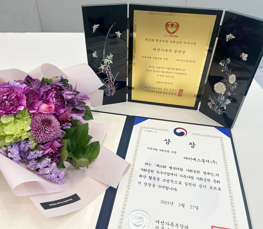 [하비엔뉴스 = 홍세기 기자] 아이에스동서가 지난 27일 한국프레스센터에서 열린 ‘제15회 행복더함 사회공헌 캠페인’ 시상식에서 가족사랑 사회공헌 부문 우수기업으로 선정돼 여성가족부 장관상을 수상했다.