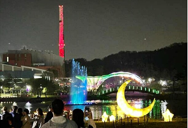 | △사진=김포시 김포시는 마산동 자원화센터 굴뚝을 스테인드글라스와 아트조명을 활용한 미술작품으로 만들어 '하늘과 땅을 잇는 예술, 빛의 굴뚝 미래를 여는 창'으로 재탄생한 모습 [제공/김포시] |