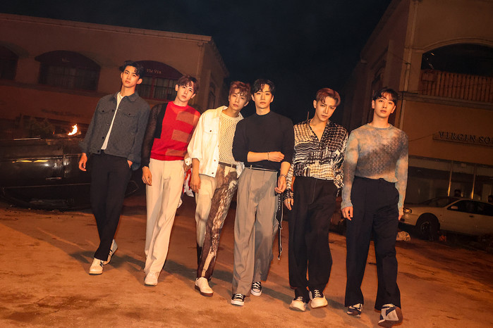 개인 컷에서는 6인 6색 섹시미가 돋보였다. 주머니에 두 손을 꼽은 우영은 특유의 여유로움을 자랑했고, 막내 찬성은 실크 셔츠와 흑발 헤어로 냉미남의 정석 비주얼을 뽐냈다. 준호는 물에 젖은 셔츠와 안경 스타일링으로 부드러우면서도 와일드한 반전 매력을 여실히 살렸다. JUN. K(준케이)-닉쿤-택연은 강렬한 사랑의 스파크를 느낀 순간의 모습이 포착됐다. 혼란스러운 공간 속 오직 상대방을 향한 시선은 첫눈에 사랑에 빠진 인물의 심리를 효과적으로 드러내며 짜릿한 설렘을 안겼다.