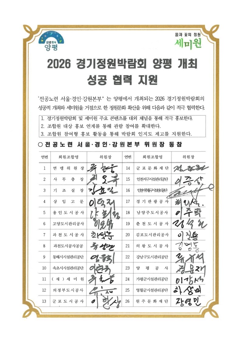 이어서 여인성 양평군 정원산림과장은 “전공노련 서울·경인·강원지역본부의 적극적인 홍보 지원과 조합원 참여 협력에 깊이 감사드린다”며 “이번 협력을 계기로 세미원과 양평군이 함께 힘을 모아 2026 경기정원박람회 준비를 더욱 탄탄하게 이어가겠다”고 말했다. 이어 “행정과 현장이 함께 만들어가는 협력 덕분에 박람회 성공 개최에 큰 힘이 될 것”이라고 덧붙였다.