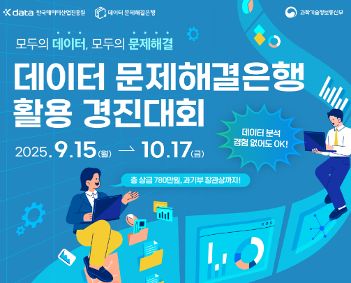 「데이터 문제해결은행 경진대회」는 대한민국 국민 누구나 참여할 수 있으며, 10월 17일(금)까지 데이터 문제해결은행 포털을 통해 온라인으로 접수할 수 있다. 최종 선정된 12개 수상작에 대해 과기정통부 장관상 2점을 비롯한 진흥원장상과 총 7백80만 원 규모의 상금이 수여된다. 대회는 ▲데이터레시피 개발 부문(데이터 분석 가이드라인을 설계·제안)과 ▲문제해결랩 활용 부문(포털의 분석 도구를 활용해 문제해결 방법을 제시)으로 나뉘어 운영된다. 참가자는 분야별 데이터 활용 아이디어를 자유롭게 제안할 수 있다.