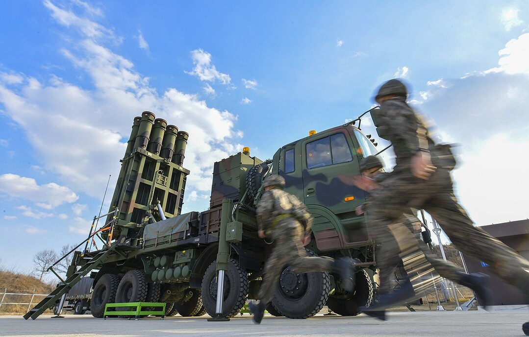 | 천궁-Ⅱ 발사대로 뛰어가는 장병들 [사진=공군] |