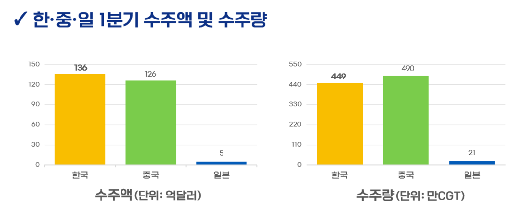 | 한·중·일 1분기 수주액 및 수주량. [자료=산업통상자원부] |