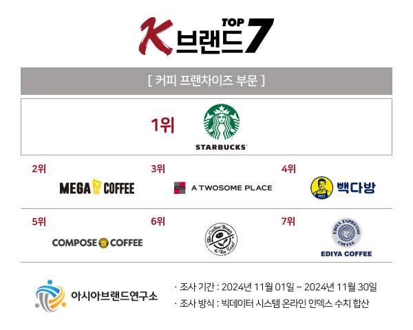 이번 ‘K-브랜드 톱7’ 커피 프랜차이즈 부문은 스타벅스가 1위를 수성했으며, 2위 메가커피, 3위 투썸플레이스, 4위 빽다방, 5위 컴포즈커피, 6위 커피빈, 7위 이디야커피 등이 상위권을 차지했다.
