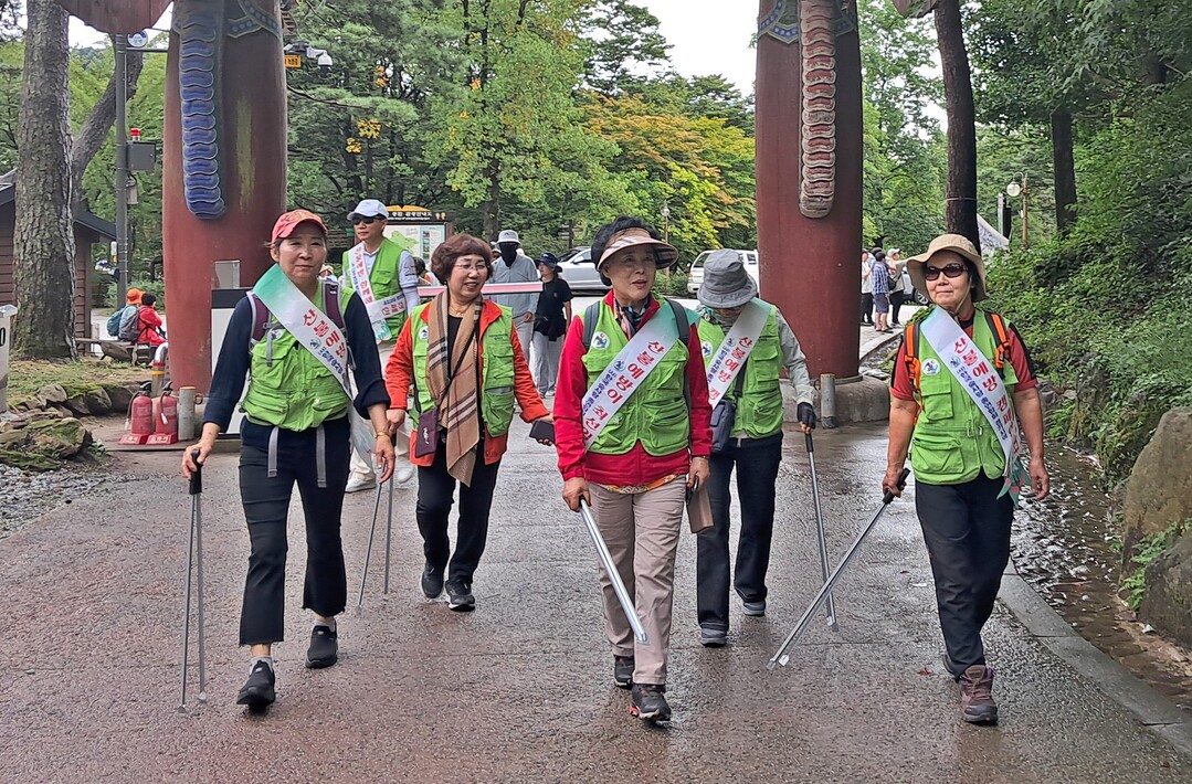 | △사진=지난 20일 경기도 양평군 용문산에서 산불예방 캠페인과 환경정화 활동을 펼치고 있으며, 김필례 총재는 중앙에서 걸어가고 있다. [제공/숲사랑 경기지역] |