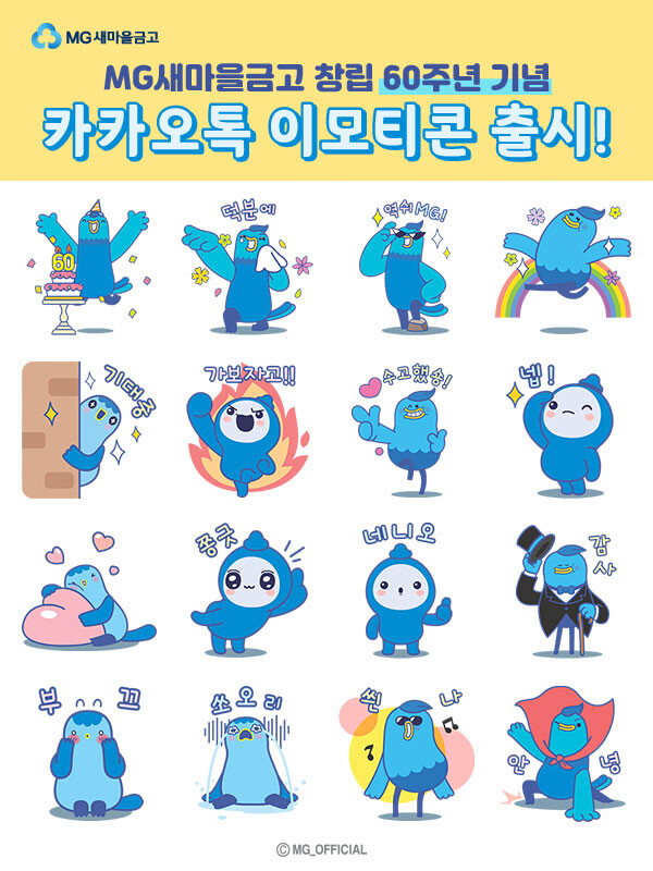 이번에 선보인 이모티콘은 새마을금고 캐릭터 ‘블루원정대’와 ‘김금고’를 활용해 16종으로 제작됐다. 새마을금고 창립 60주년을 축하하는 내용을 담아 일상에서 재미있게 사용할 수 있는 움직이는 이모티콘이다.