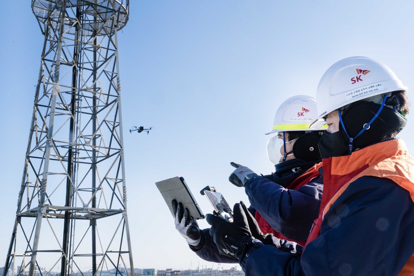 | ▲ SK텔레콤과 SK오앤에스 직원이 드론을 통해 통신탑을 점검하는 모습. [사진=SK텔레콤] |