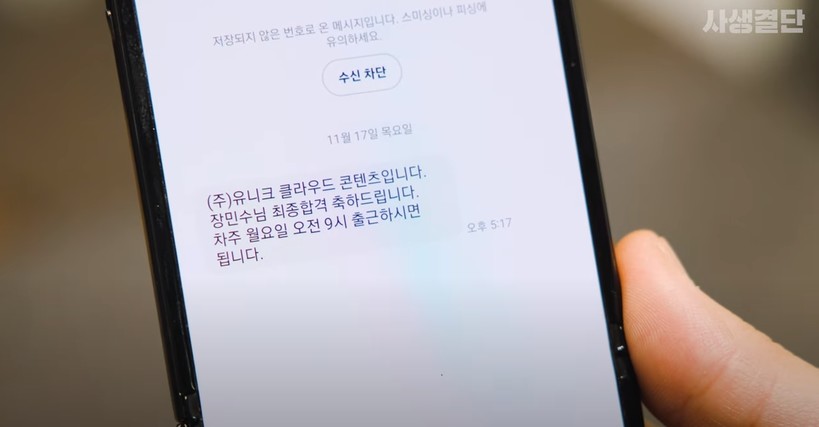 | ▲ 면접 후 합격 통지 문자를 받은 민수. [사진=만두제작단] |
