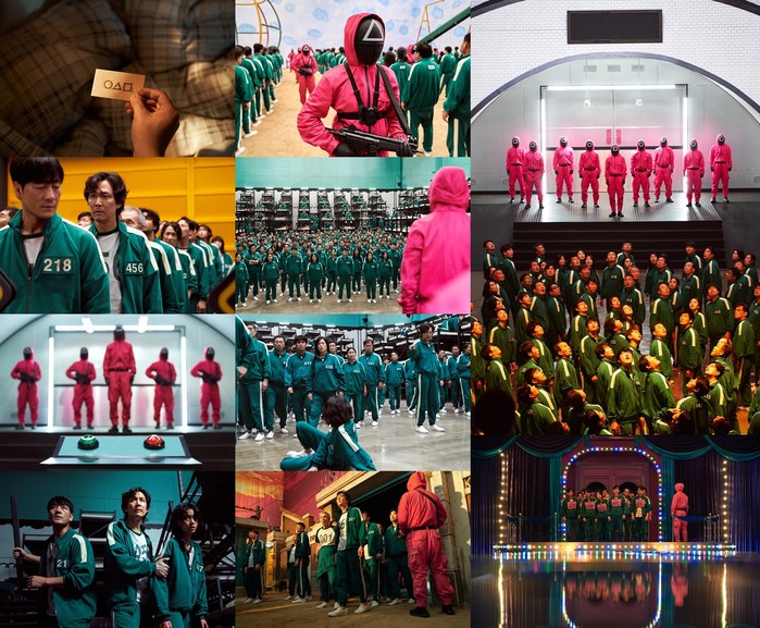 공개된 보도 스틸은 극한의 게임에 참가하게 된 456명의 참가자들과 가면을 쓴 정체 모를 관리자들, 그리고 거대한 스케일의 게임이 모두 담겨 있다. 동그라미, 세모, 네모가 그려진 명함을 받고 목숨 건 서바이벌에 참가하게 된 456명의 참가자들은 각자의 사정으로 사회에서 벼랑 끝으로 몰린 이들이다. 참가자들은 일생일대의 기회를 잡아 인생을 되돌리고 싶어 낯선 제안을 수락했지만 이내 게임의 대가가 본인의 목숨이며, 마지막까지 살아남는 단 한 명만이 모든 것을 차지할 수 있다는 사실을 깨닫게 된다. “게임 안은 바깥세상의 축소판이다. 현실에서 일어나고 있는 경쟁을 게임에 그대로 옮겨두었다”는 황동혁 감독의 말처럼 참가자들은 규합과 배신을 반복하면서 게임 안에서 극심한 경쟁과 좌절을 겪는다. 공개된 스틸에서는 파격적인 설정을 위화감 없이 그려낸 배우들의 강렬한 연기를 엿볼 수 있다. 나이도, 성별도, 국적도 다른 배우들은 살기 위해 타인을 해쳐야 하는 아이러니한 상황에 놓인 캐릭터들의 갈등과 고뇌를 생생하게 그려냈다. 타인은 물론 자신조차도 믿을 수 없는 극한의 상황에서 만난 참가자들이 매 게임에서 보여주는 선택이 만들어갈 다채로운 이야기가 매 순간 충격과 반전을 선사할 예정이다.