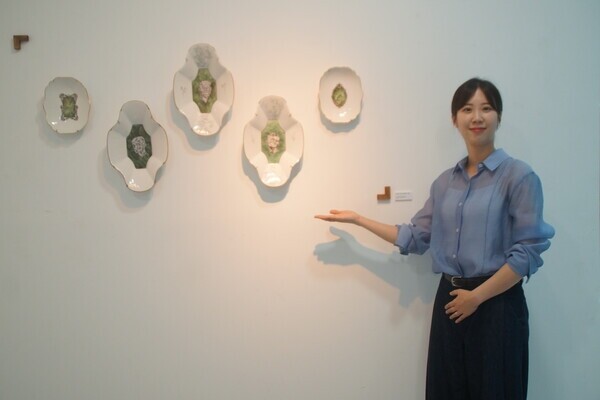 | △사진='그릇 위에 그림' 김길은 작가가 출품작(作)을 설명하고 있다. |