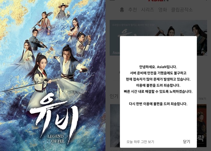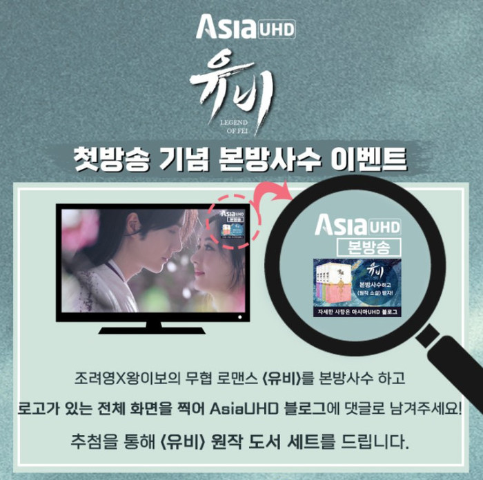 지난 24일 밤 4K로 즐기는 프리미엄 채널 AsiaUHD에서는 '유비'(有翡, Legend Of Fei) 1화가 방송됐다. 방송 직후 모바일 AsiaN 및 홈페이지를 통해 다시보기 영상이 공개, 접속자가 폭주하며 일시적으로 서버가 마비됐다.