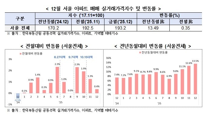 지난해 12월 서울 아파트 매매 실거래가는 전월 대비 0.35% 상승했으며 전년 동월 대비 13.49% 올랐다. 12월 서울 아파트 실거래가는 서울 동남권을 제외한 도심권·동북권·서북권·서남권에서 전월 대비 상승하며 서울 전체 기준 0.56% 올랐다. 동북권이 전월 대비 1.01% 올랐다.