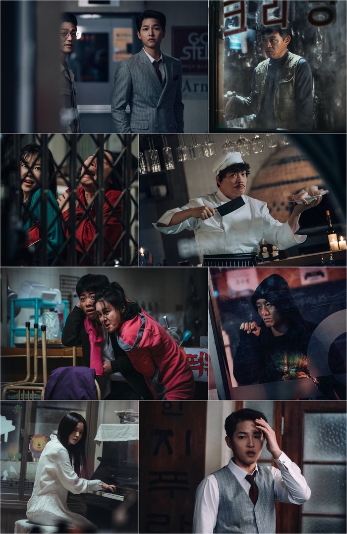 ‘철인왕후’ 후속으로 오는 20일 첫 방송되는 tvN 새 토일드라마 ‘빈센조’(연출 김희원, 극본 박재범, 기획 스튜디오드래곤, 제작 로고스필름) 측은 8일, 수상하고 음침한 금가프라자에 들어선 빈센조(송중기 분)의 모습을 포착했다. 냉혹한 마피아 빈센조를 당황케 한 금가프라자 패밀리의 범상치 않은 면면이 호기심을 자극한다.