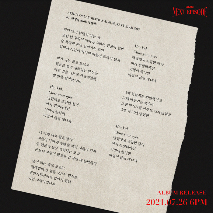 [하비엔=노이슬 기자] AKMU의 [NEXT EPISODE] 서막을 장식할 앨범 수록곡 '전쟁터' 가사 전체가 깜짝 공개돼 관심이 쏠린다.