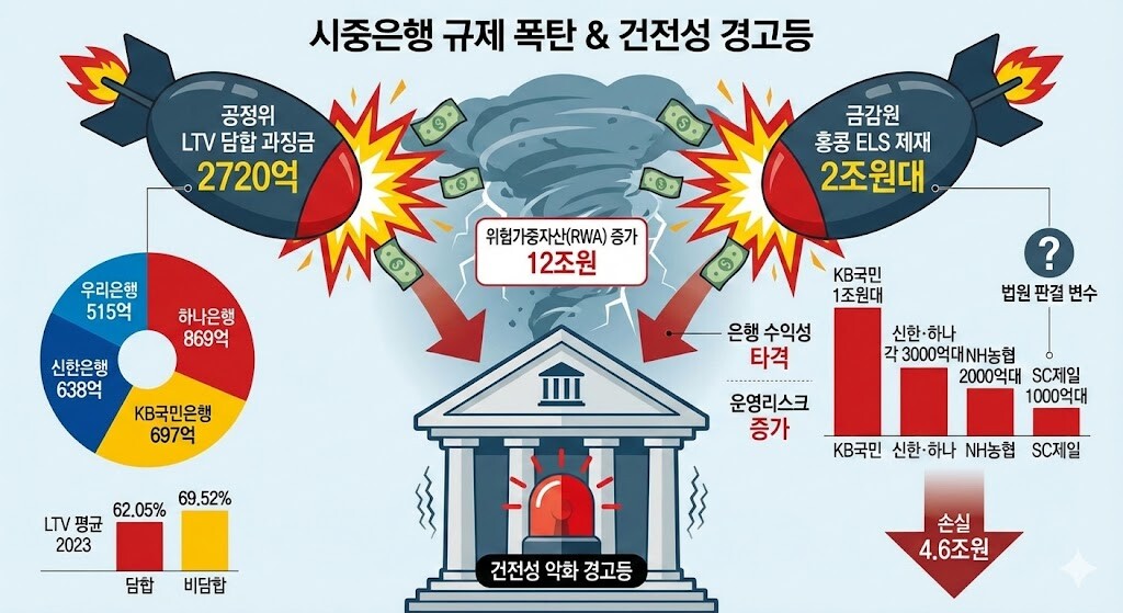 [HBN뉴스 = 홍세기 기자] 국내 주요 시중은행들이 규제당국들의 대규모 제재에 직면하면서 금융권의 건전성 관리에 대한 우려가 커지고 있다. 공정거래위원회의 담보인정비율(LTV) 담합 과징금에 이어 금융감독원의 홍콩H지수 주가연계증권(ELS) 불완전판매 제재 절차가 진행 중으로, 조(兆) 단위의 규제 부담이 현실화되고 있다.