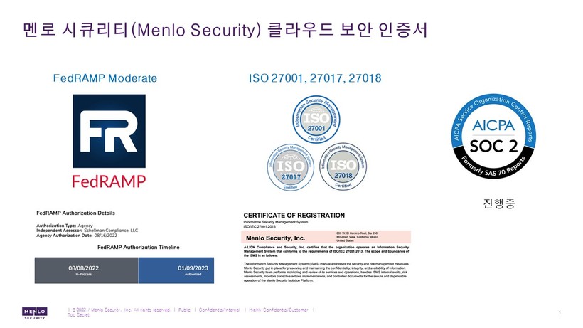멘로시큐리티의 웹격리 보안 솔루션은 유럽 개인정보보호법, 미국 연방 정부 클라우드 보안 평가제도 패드램프, 국제 표준 정보보호인증, 클라우드 서비스 정보보호 관리체계 등의 다양한 국제 보안 표준을 충족해 국내 공공 기관의 보안 요구 사항을 지원할 수 있다.