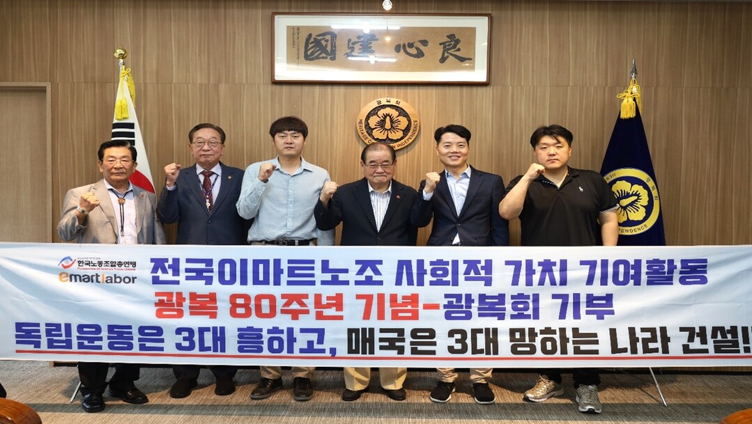 [하비엔뉴스 = 이동훈 기자] 전국이마트노동조합(위원장 김상기)이 광복절 80주년을 맞아 광복회를 찾아 조합원들의 정성을 모은 기부금을 전달하며, 사회적 가치 실현에 앞장섰다. 작년에 이어 두 번째로 이뤄진 이번 나눔은 노동조합 차원에서 잊혀가는 독립운동가 정신을 되새기고 그 후손들을 응원하기 위한 의미 있는 행보로 평가받고 있다.