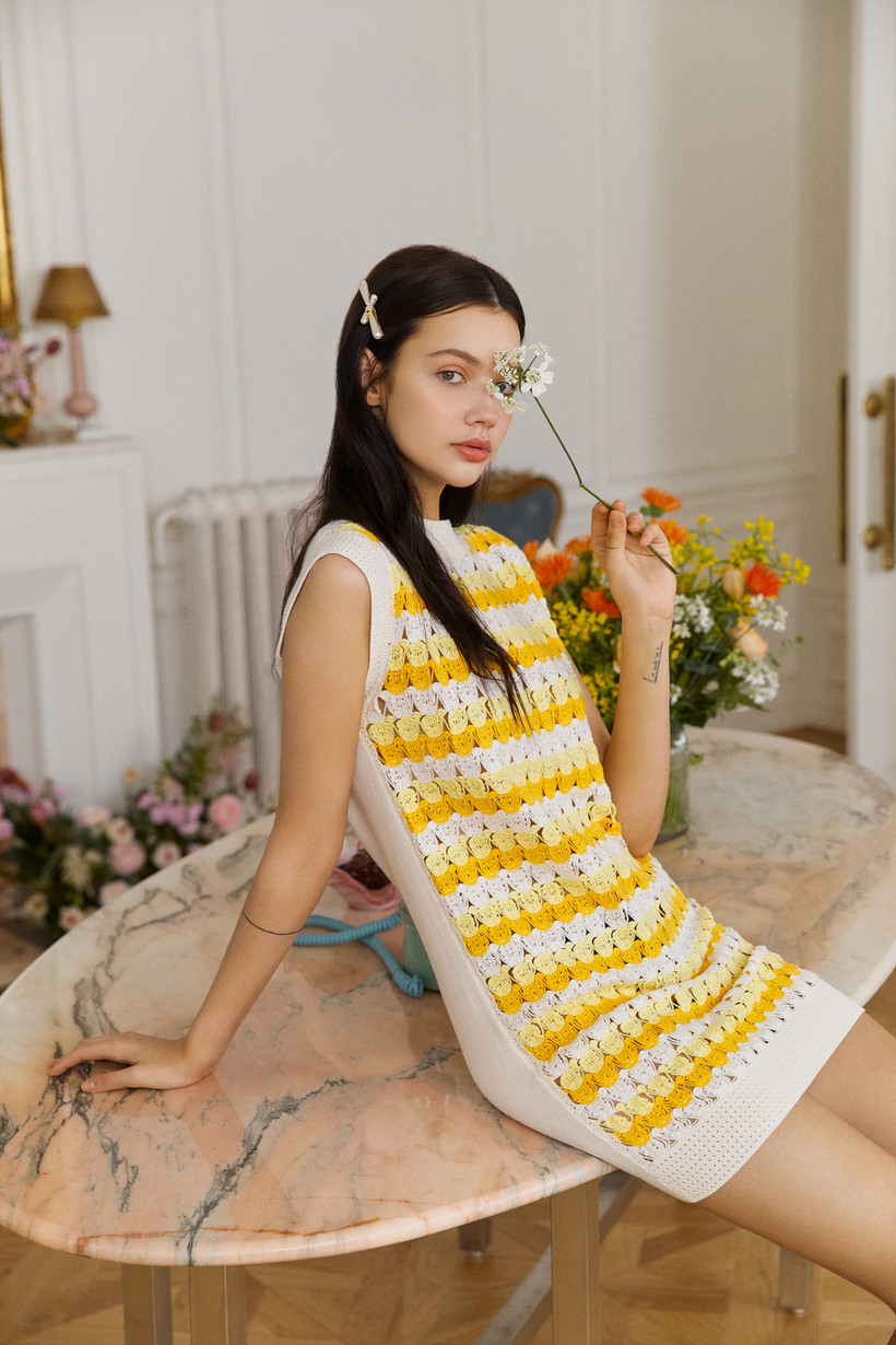 꽃무늬가 들어간 크로셰 니트 원피스와 스커트, 뷔스티에, 베스트를 블루, 옐로, 그린 등 다양한 컬러로 연출했고, 줄무늬나 그라데이션 디자인으로 포인트를 준 크로셰 니트 상의와 원피스가 대표적이다.