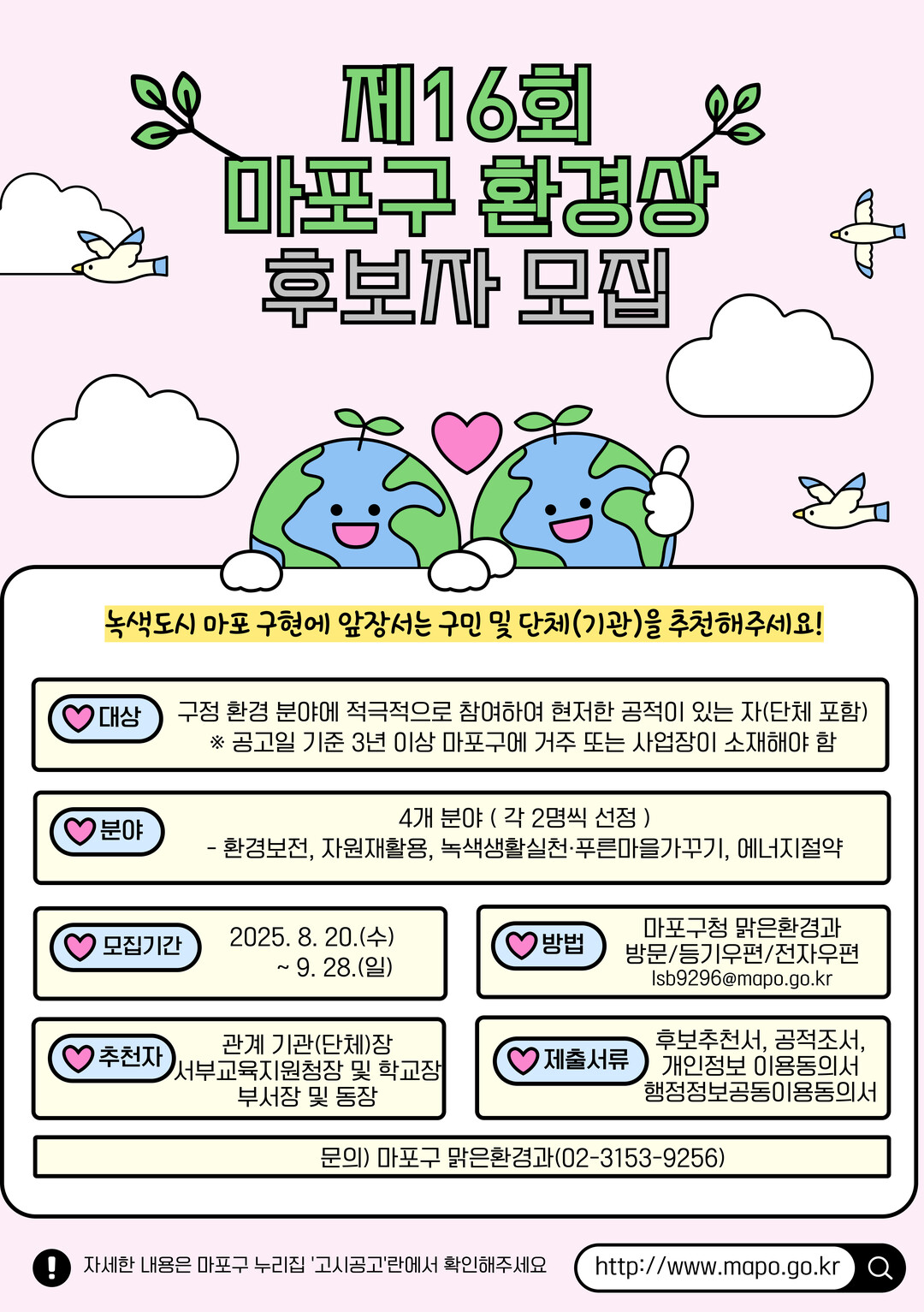 추천 대상은 공고일 기준 3년 이상 마포구에 거주하거나 소재하며 환경 분야에 적극적으로 참여해 현저한 공적을 세운 개인 또는 단체다.