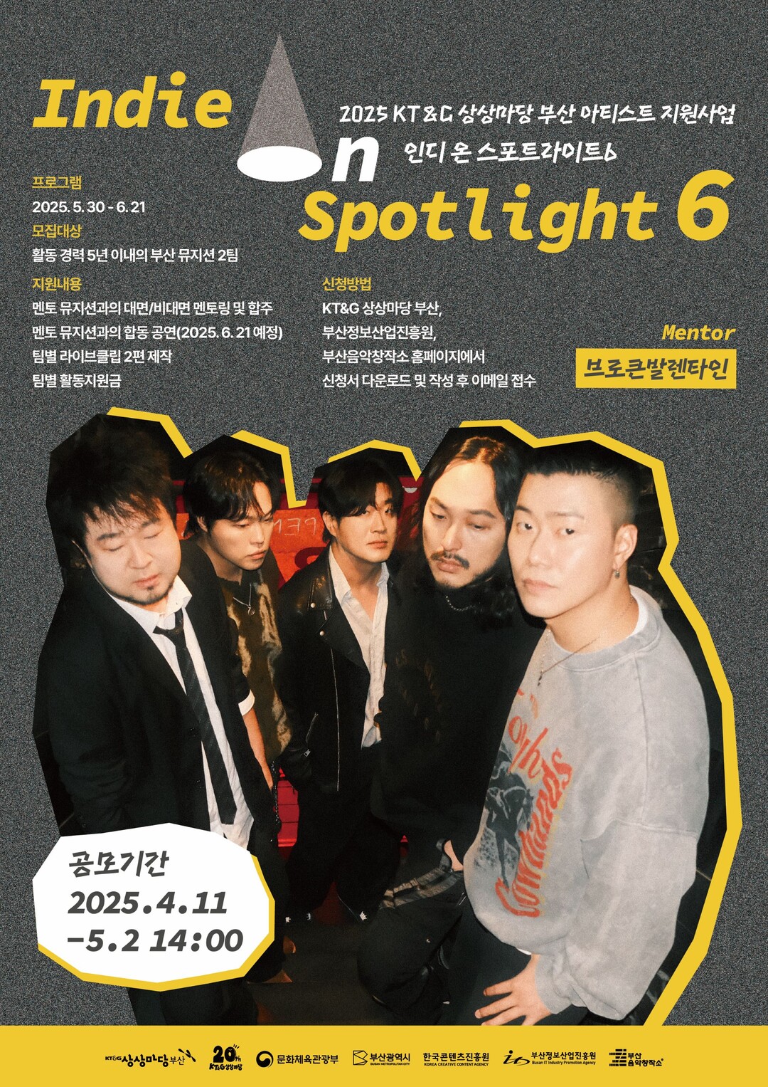 최종 선정 팀은 활동비뿐 아니라 5인조 밴드 ‘브로큰 발렌타인’에게 작사·작곡법, 공연준비에 대한 실질적 코칭 등 멘토링을 받는다. 또 오는 6월21일 KT&G 상상마당 부산 라이브홀에서 멘토 아티스트와 합동 공연의 기회가 주어진다.