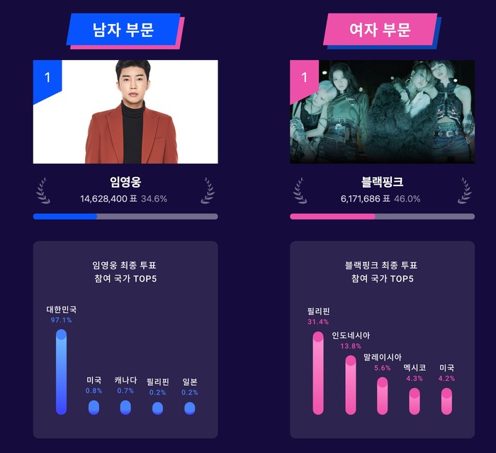 남자부문 1위 임영웅은 총 17, 433, 743 표를 얻었고(1차 589,926, 2차 2,215,417, 3차 14,628,400), 블랙핑크는 총 8,508,368표 (1차 650,530, 2차 1,686,152, 3차 6,17 1,686)를 획득하며 1위에 올랐다. 국가별로는 한국, 인도네시아, 필리핀, 말레이시아, 미국, 멕시코, 태국, 일본, 브라질, 인도, 페루, 아르헨티나, 베트남, 대만, 홍콩 등의 순으로 이용자들의 참여가 이어졌다.